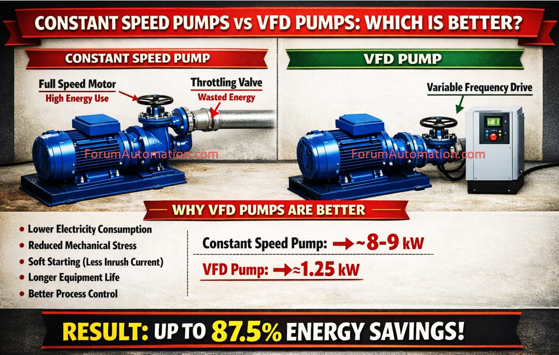 When comparing constant speed pumps and VFD (Variable Frequency Drive) pumps is the better option in most applications especially where the flow demand varies.