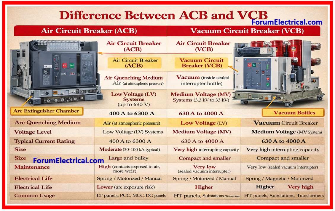 | Feature | ACB (Air Circuit Breaker) | VCB (Vacuum Circuit Breaker) |