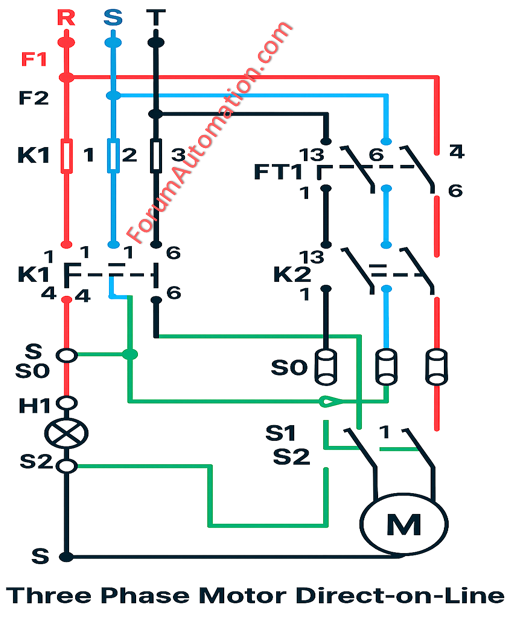 A thermal overload relay (FT1) is installed between the contactors & the motor to protect it from overcurrent. The motor (M) is a three-phase machine that is connected to the contactors’ outputs.
