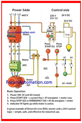 It is a traditional Direct-On-Line (DOL) starting configuration that is often used in industrial environments. Appropriate for students, field technicians, & automation engineers.