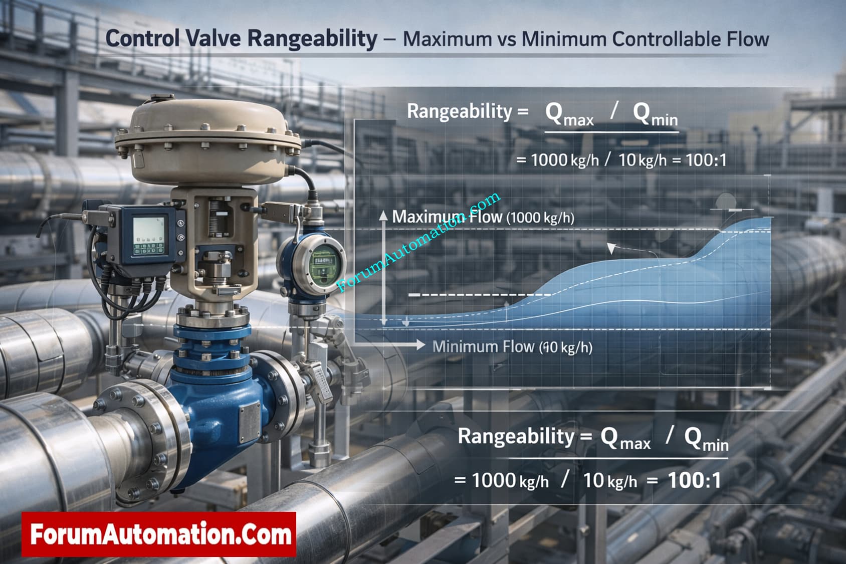 - Rangeability = Maximum value / Minimum controllable value Example: a valve that can control 1000 kg/h down to 10 kg/h has rangeability 1000/10 = 100:1.