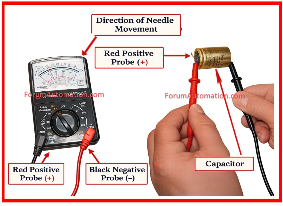 To avoid meter damage or electric shock, discharge the capacitor by shorting the terminals with a resistor (or) insulated screwdriver prior to testing.