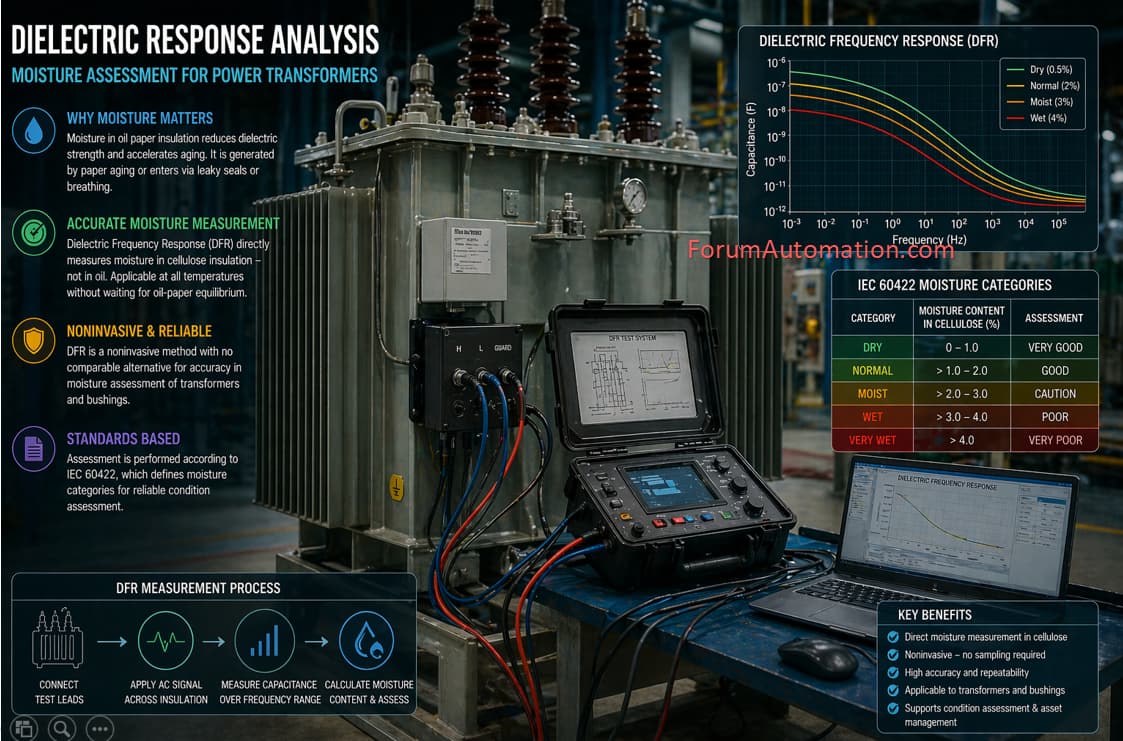 Transformer Dielectric response analysis also known as dielectric frequency response analysis is utilized to assess the moisture content of the cellulose insulation and thus determine its condition.
