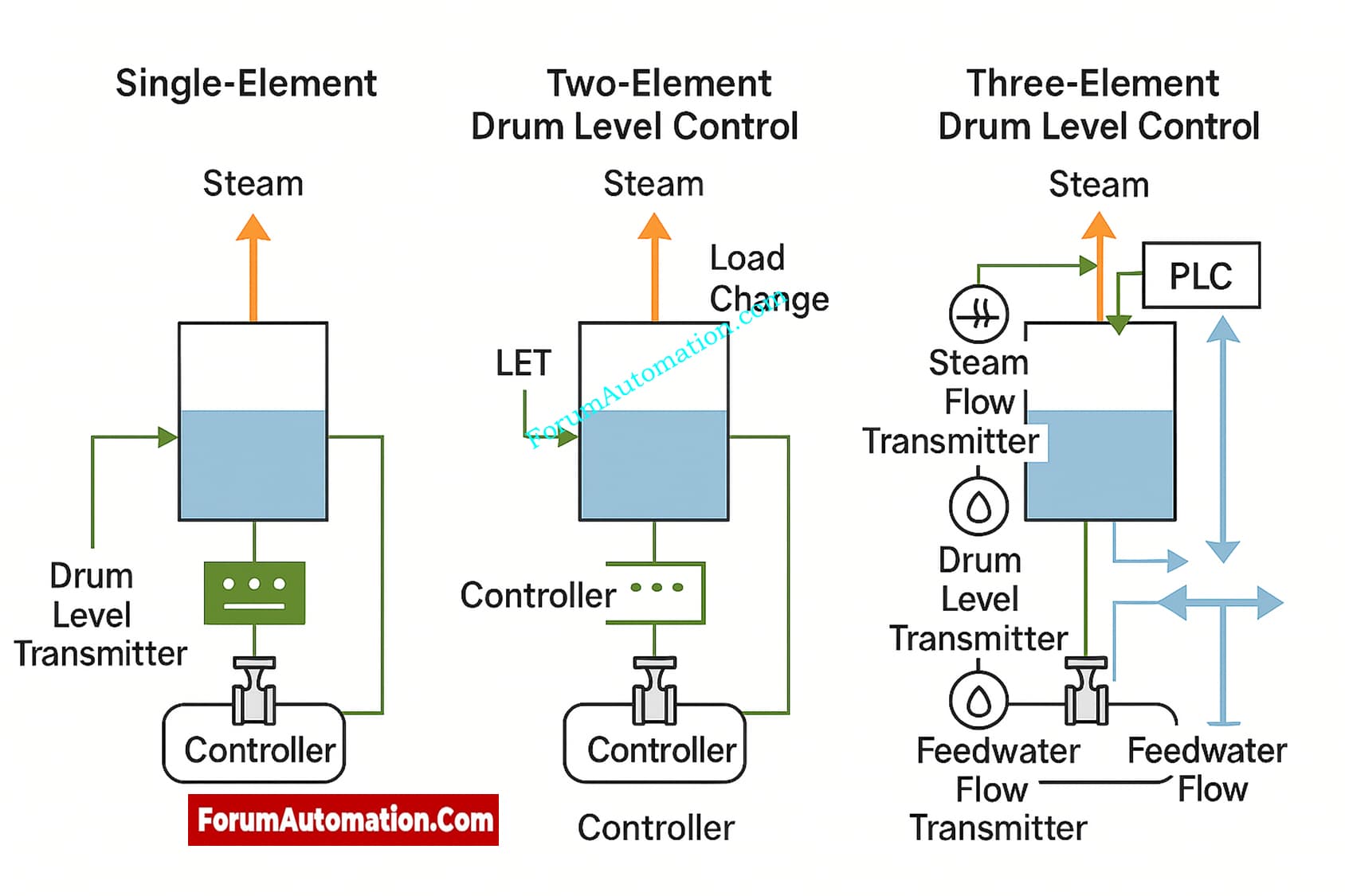 In short, the size of the boiler, the pressure it runs at, and how often the load changes all play a role in choosing between single-, two-, and three-element drum level control schemes. Three-element control is the safest and best-performing option.