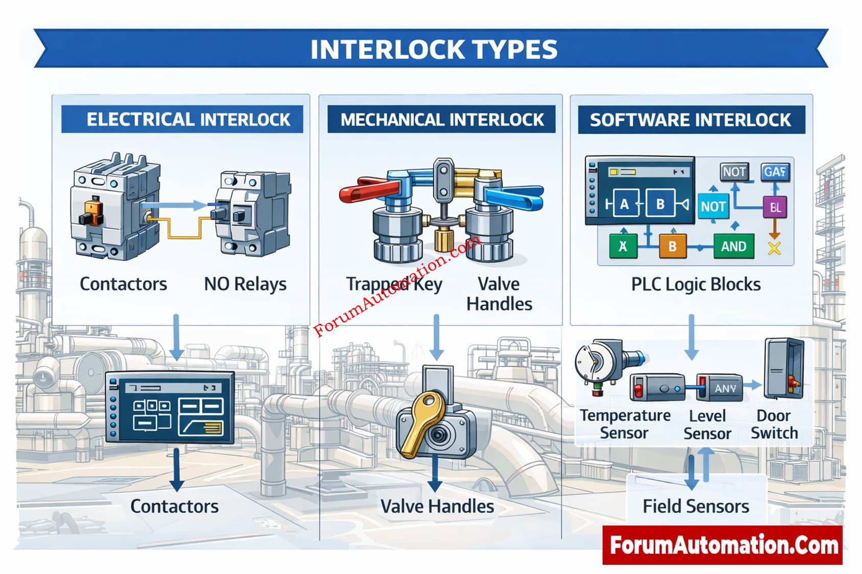 Interlocks are generally divided into three primary types in industrial automation and safety engineering. Each type has a distinct operational and safety purpose. Many PLC, DCS, and safety system design recommendations use these classifications as a reference.