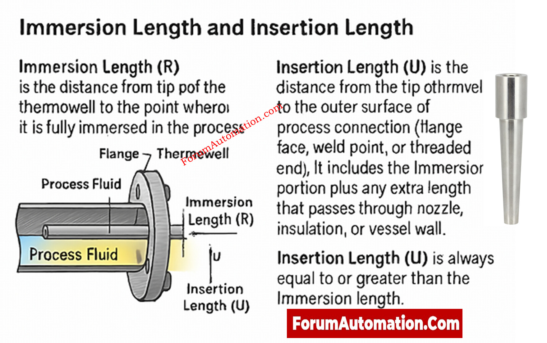 The insertion length (U) is the distance from the tip of the thermowell to the outer surface of the process connection, which could be the flange face, weld point, or threaded end. It includes the immersion part and any extra length that goes through the nozzle, insulation, or wall of the vessel. So, the insertion length is always the same as or longer than the immersion length.