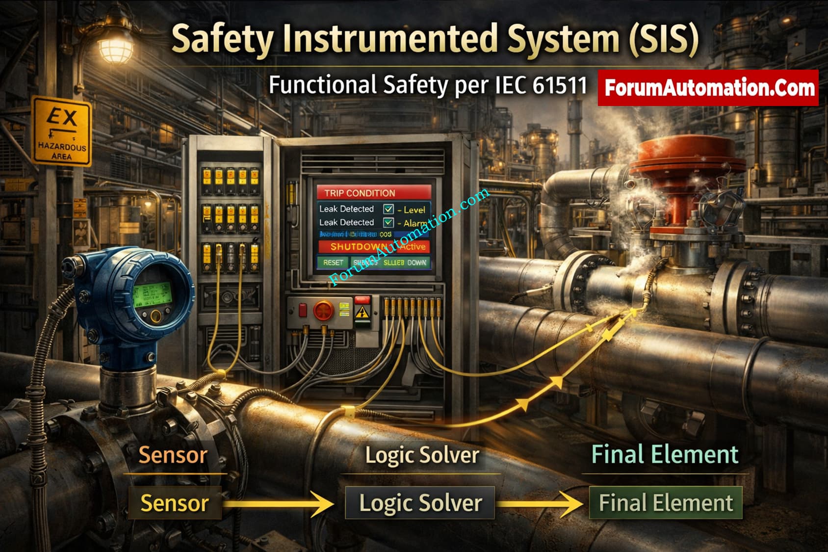 According to IEC 61511, a Safety Instrumented System (SIS) is the separate layer of protection that finds a risky process situation and shifts the plant to a safe state. It is not merely an alert or the basic control loop. Sensors, a logic solver, final elements, and the application software that goes with them are all common parts of a SIS.