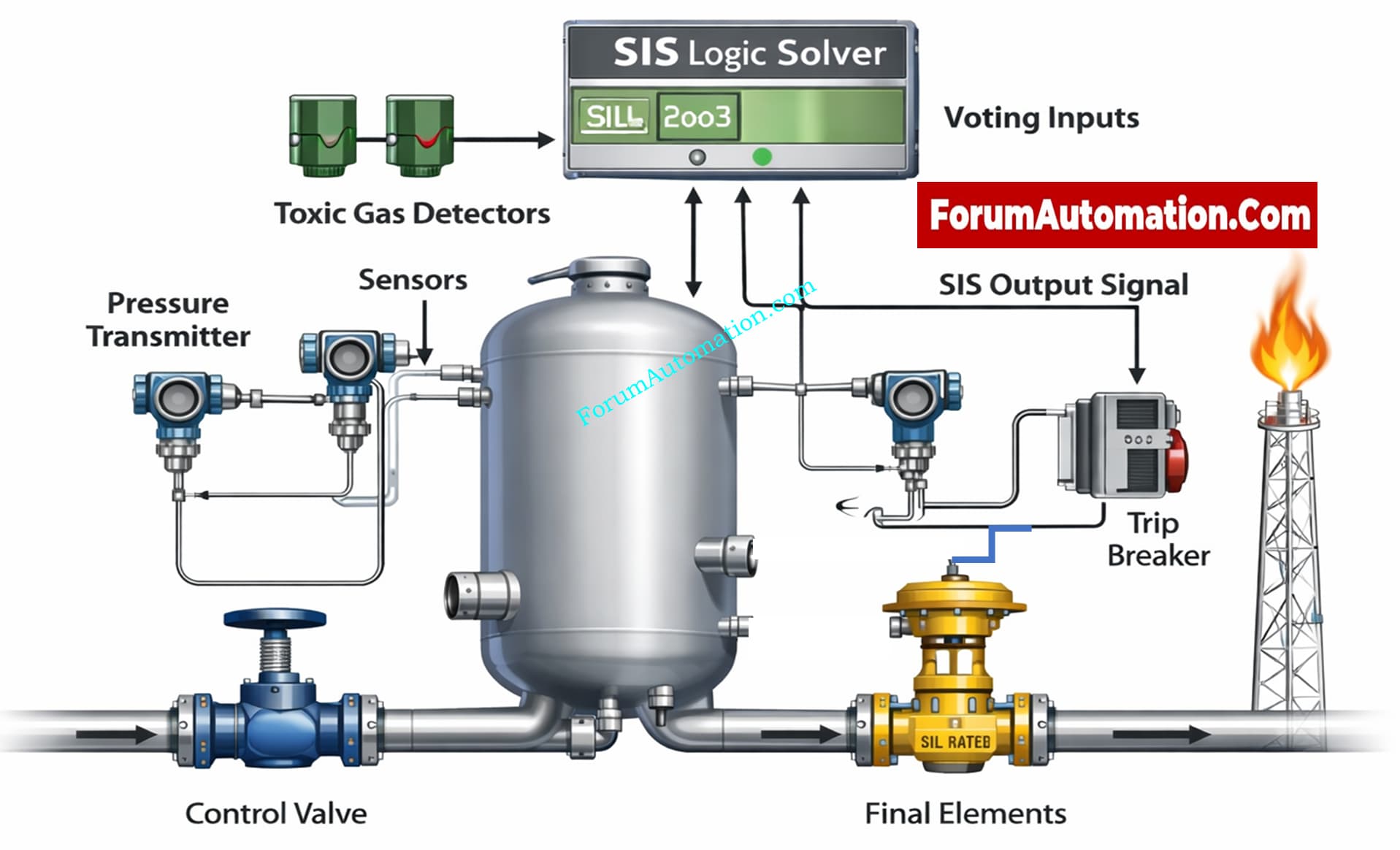 A Safety Instrumented System (SIS) is a separate layer of protection that automatically puts a process into a safe state when certain dangerous situations are found. Sensors, logic solvers, and final elements all work together in SIS to carry out Safety Instrumented Functions (SIFs). Every SIF reacts to a specific process change, such high pressure or high temperature, and takes steps to defend itself. SIS is said to have lowered the risk of the procedure to a level that is acceptable. The Safety Integrity Level given during hazard analysis and risk assessment operations determines how much risk is reduced. Sensors are good at finding unusual situations. The logic solver checks inputs and runs safety logic that has been accepted. Final parts, including shutdown valves, breakers, or trips, make the process safe within the time frame that is needed. SIS follos a functional safety lifecycle that starts with HAZOP and LOPA and goes through design, installation, commissioning, operation, and decommissioning. To keep the claimed safety integrity, proof testing and maintenance are necessary.