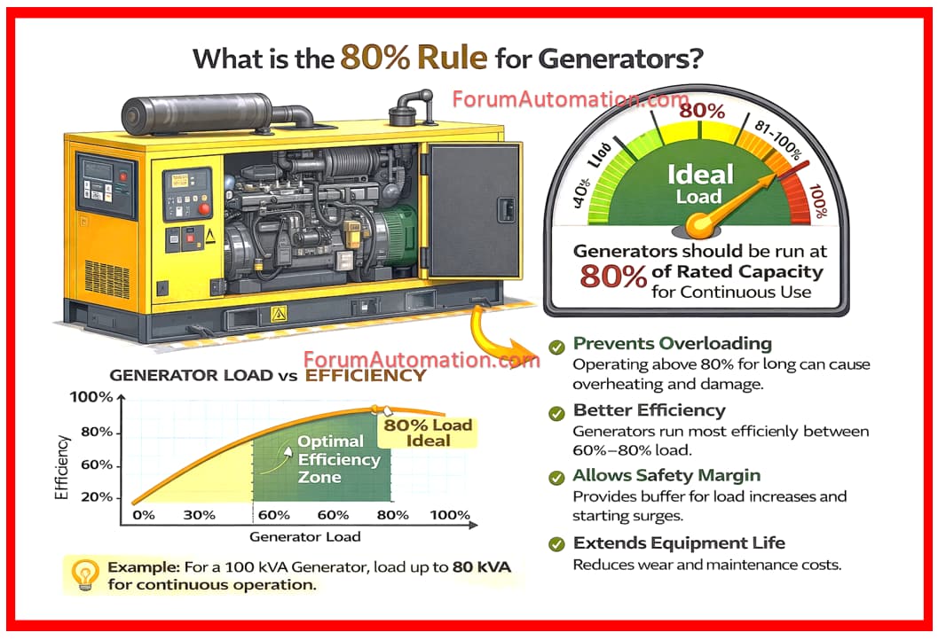 The 80% rule is a practical guideline to ensure safe, efficient and reliable generator operation extending lifespan while maintaining performance.