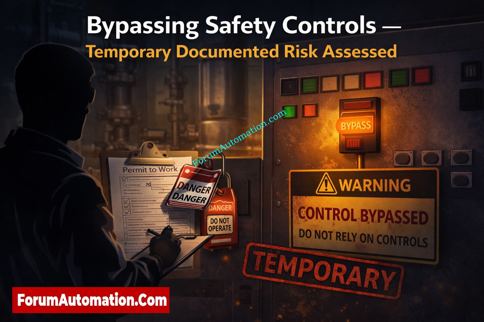 Bypassing safety controls implies turning off, isolating, or overriding a safety device’s function on purpose so that the process can keep going or maintenance can keep going. Disabling interlocks, forcing outputs, deleting hardware linkages, or temporarily stopping alarm trips are all common bypass operations. Bypasses are occasionally needed for troubleshooting, commissioning, or controlled maintenance, but they increase risk since they take away safety features that are meant to stop dangerous situations.
