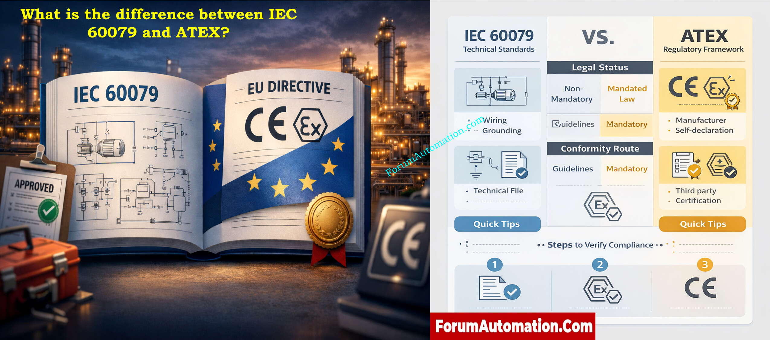 IEC 60079 is a set of international technical standards that tells you how to protect equipment and how to classify areas. ATEX is the set of standards in the European Economic Area that control the placement of equipment and safety rules in explosive atmospheres. It includes directives 2014/34/EU and 1999/92/EC. Both have similar technological content, but they differ in how they follow the law and what kind of documentation they need.
