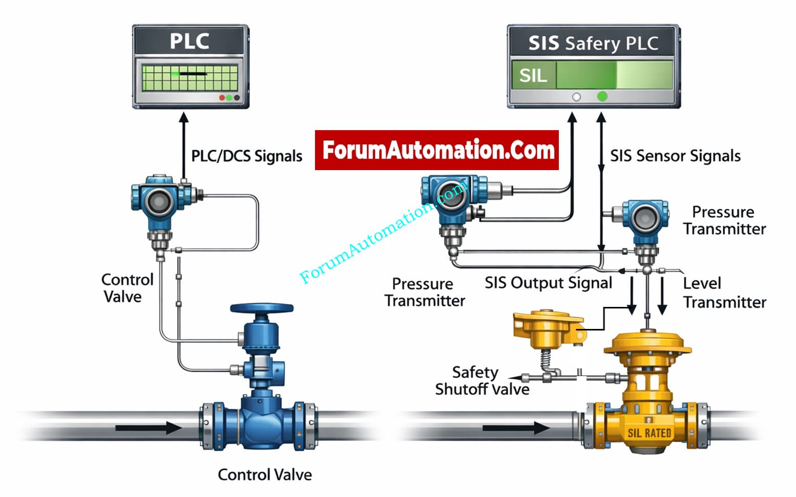 PLC systems are used for conventional process control, sequencing interlocks, and automation. They make production better and keep the process stable. SIS is committed to keeping people, the environment, and property safe by transitioning the process to a safe state when conditions are dangerous.