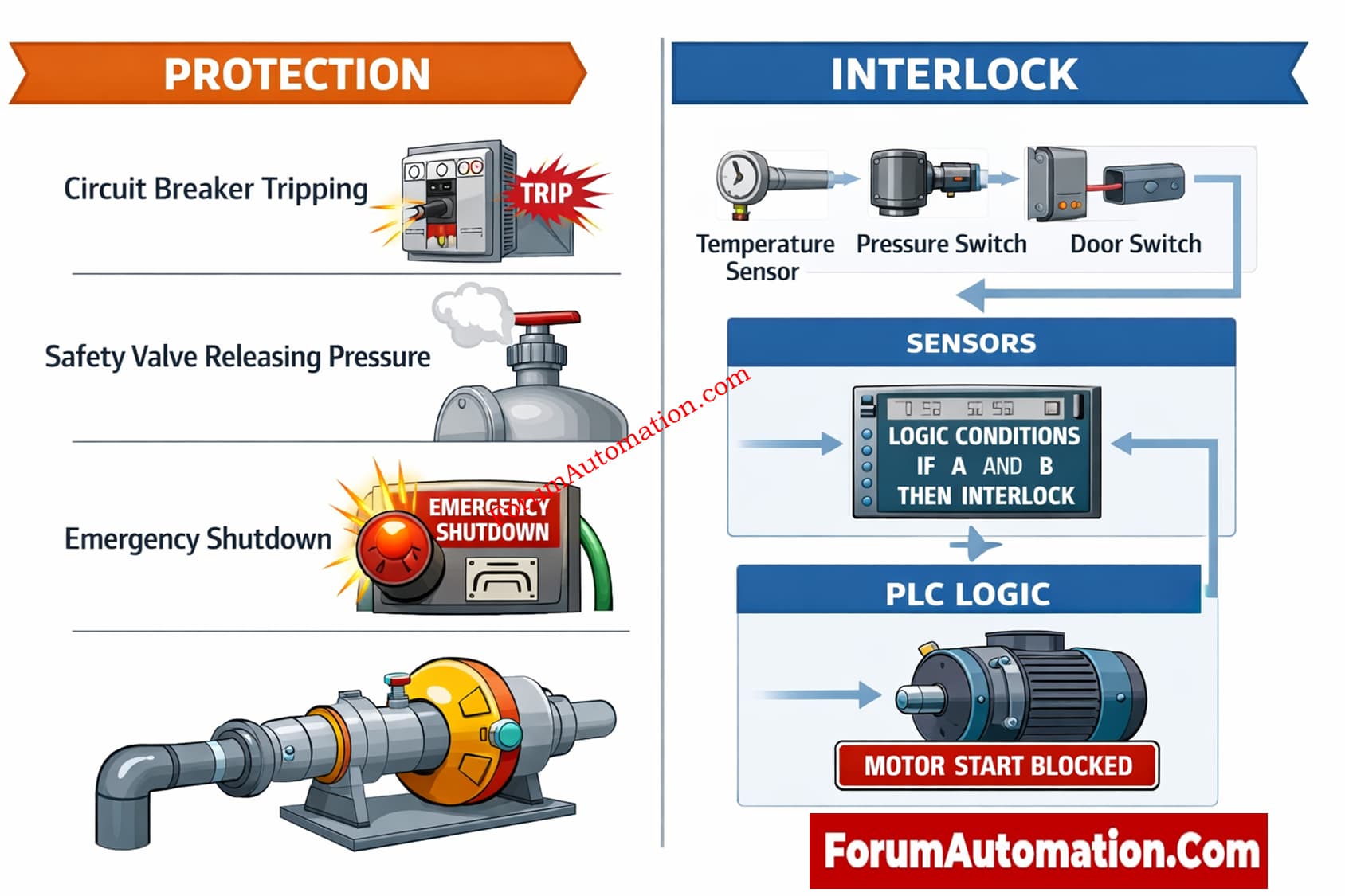 Protection and interlock are two important ideas in industrial automation and electrical/instrumentation systems. However, they have different goals and work at various points in the process of preventing risk.