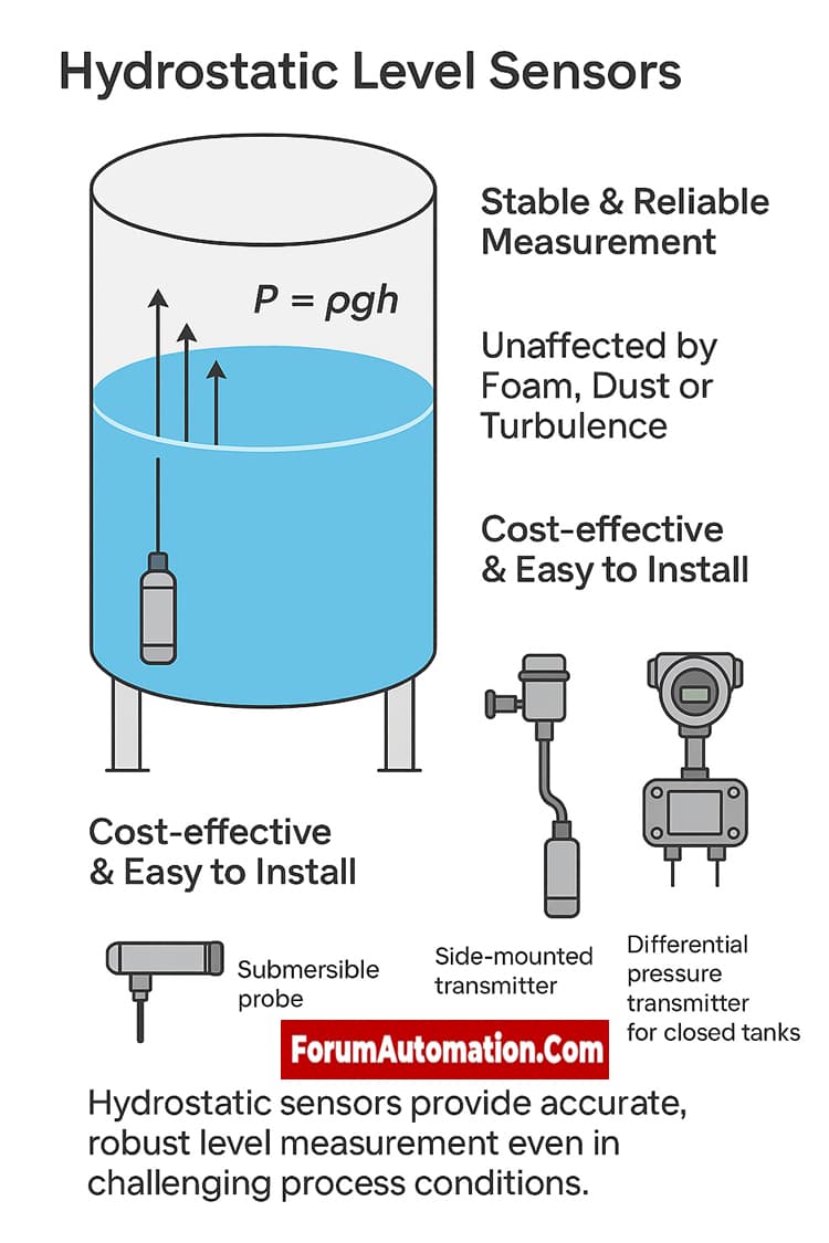 The best thing about hydrostatic level sensors is that they are reliable and stable while sensing liquid levels in many different industrial settings. The basic idea behind hydrostatic level measurement is that the pressure at the bottom of a column of liquid is equal to the height and density of the liquid (P = ρgh). Hydrostatic level sensors can precisely find the level of a liquid if they know its density and can measure this pressure. One of the best things about hydrostatic sensors is that they are quite strong. Hydrostatic sensors are better than other ways to measure levels since they aren’t impacted by foam, dust, turbulence, or changes in viscosity. This makes them good for tough situations with dirty or agitated liquids. They are also cheap and easy to install, and most of the time, existing tanks or pipelines don’t need to be changed much. There are many kinds of hydrostatic sensors, such as submersible, side- or bottom-mounted pressure transmitters, and differential pressure transmitters for closed tanks. This gives you options based on what the process needs. Differential pressure transmitters separate gas pressure in pressurized tanks for accurate measurement, while submersible sensors can be put directly into the liquid.