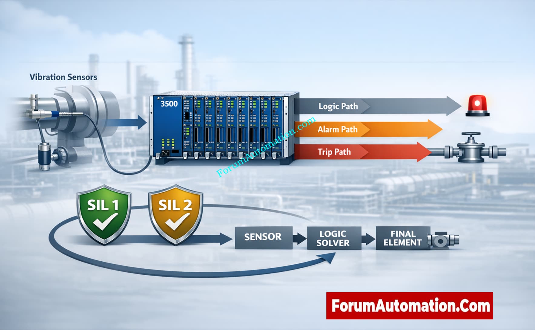 The 3500 system makes warnings and trip signals based on vibration limits in real-world plant settings. But most of the time, a dedicated SIS or ESD system does the ultimate shutdown. Before giving any SIL level, engineers must check the module certification, proof test intervals, and system design. If you assume SIL compliance without fully validating the loop, you could put yourself in a lot of danger and fail audits.