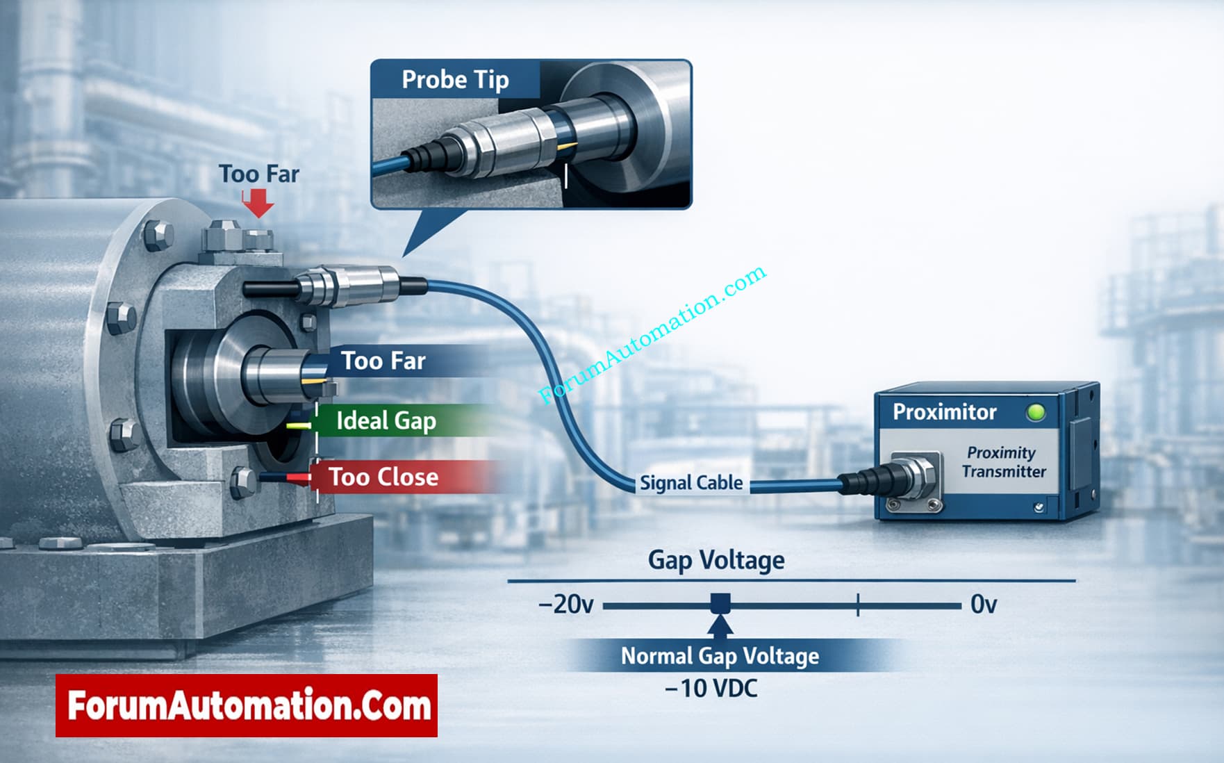 In its linear operating range, the output voltage of the proximity probe is usually between -2 V and -18 V DC. The gap voltage, on the other hand, is the most crucial thing to keep in mind when installing and calibrating. The ideal gap voltage is about minus 10 V DC, however it can be anything from minus 9 V to minus 11 V. This setting in the middle makes sure that the probe works within its linear range and can correctly pick up shaft movement in both directions without distorting or saturating the signal.