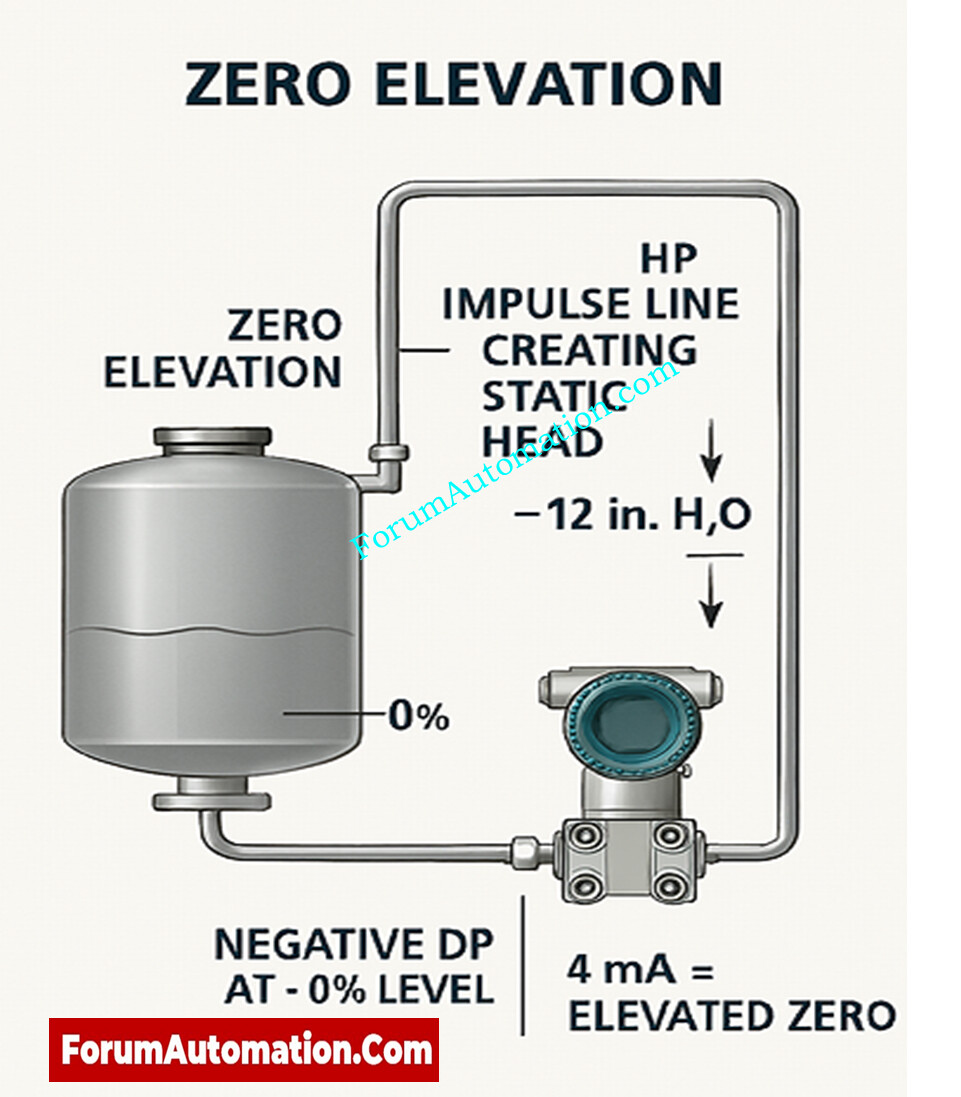 Zero elevation on a DP (Differential Pressure) level transmitter means that the transmitter must measure negative differential pressure at the zero (empty) level. This means that the 4 mA point is set higher than the actual lower pressure that is applied to the transmitter. This happens a lot because of where the transmitter is mounted, not because of the process pressure itself.
