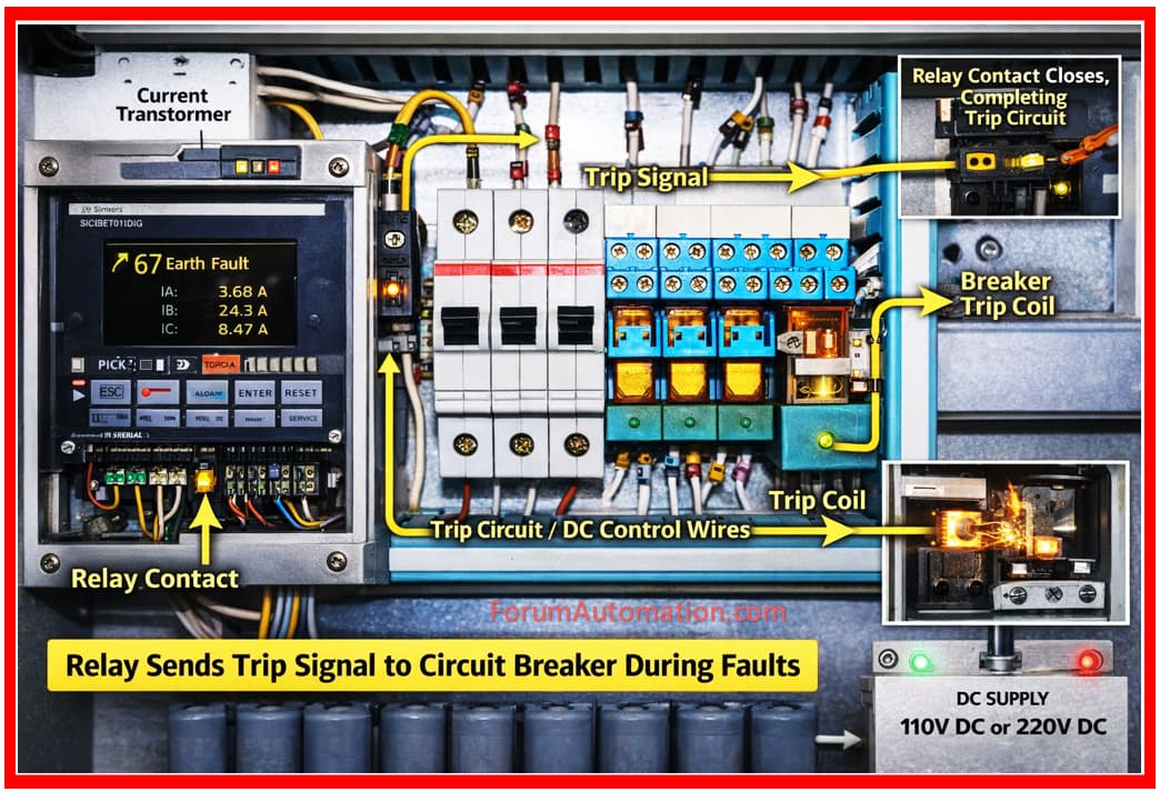 When the relay operates it closes its internal contact and completes the trip circuit, allowing current to flow to the circuit breakers trip coil.