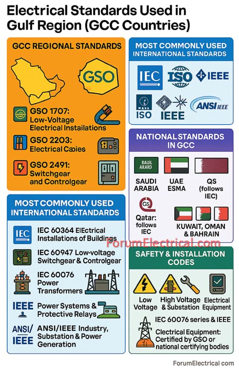 The Gulf Cooperation Council (GCC) countries which include Saudi Arabia, the UAE, Qatar, Kuwait, Oman and Bahrain use a mix of international, regional & national standards for electrical systems, installations & equipment.